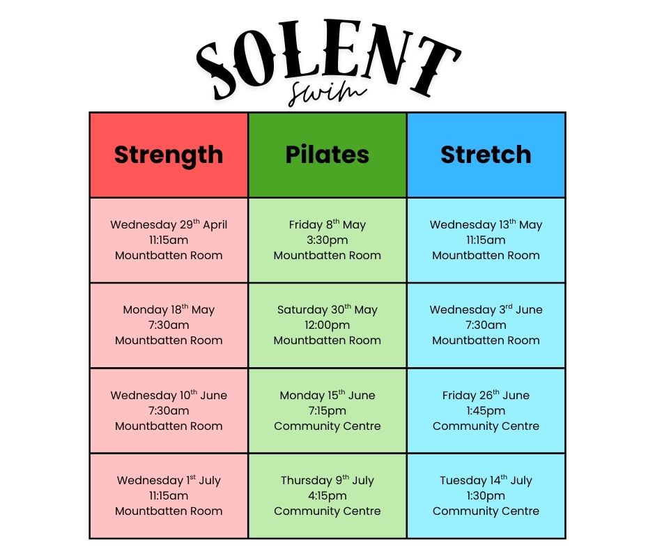 Pop-up classes for events is new for 2026 with the main aim of supporting people training for events. Two of our main events of the year are Solent Swim and Festival of Running so our sessions will be aimed at runners and swimmers. The classes will alternate between strength, Pilates and stretch class specifically planned to benefit running or swimming.